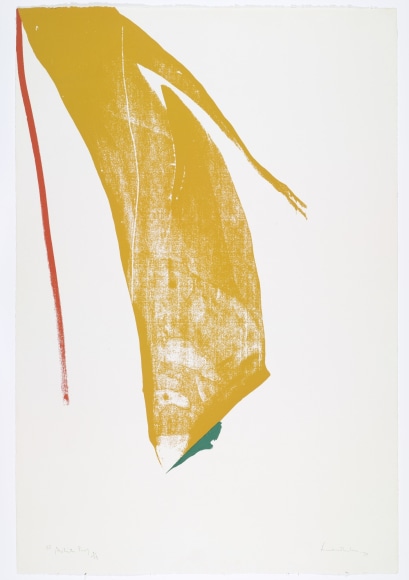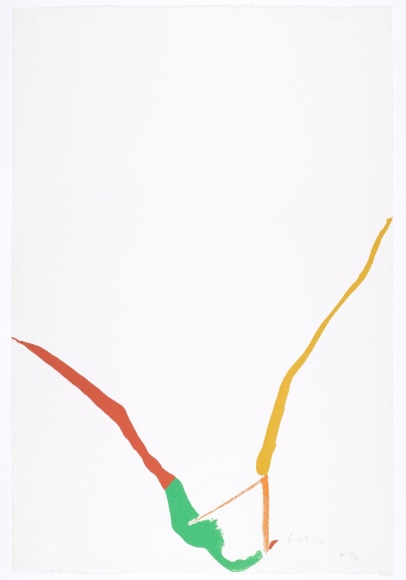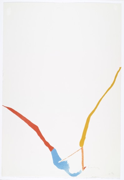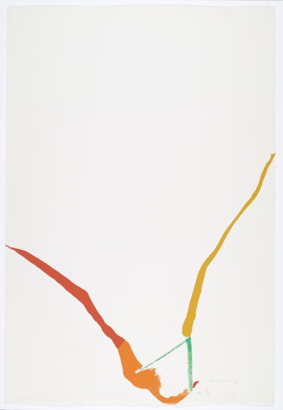 The five screen prints demonstrate the artist’s signature use of color as emotion in segmented, converging strokes of ink evoking the imagery of landscapes and animals, or of simple, pure abstraction. The works are most noticeably distinguished by their repeating deep red lines that are juxtaposed between variations of green, blue, and orange. Each quiet alteration seems to question or provide the answer to an absolute colorist’s dilemma. It is in these prints that Frankenthaler continues her career-long endeavor of striving to create visual allure in color-based bliss.