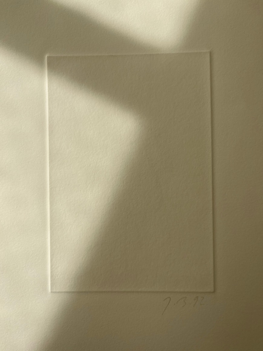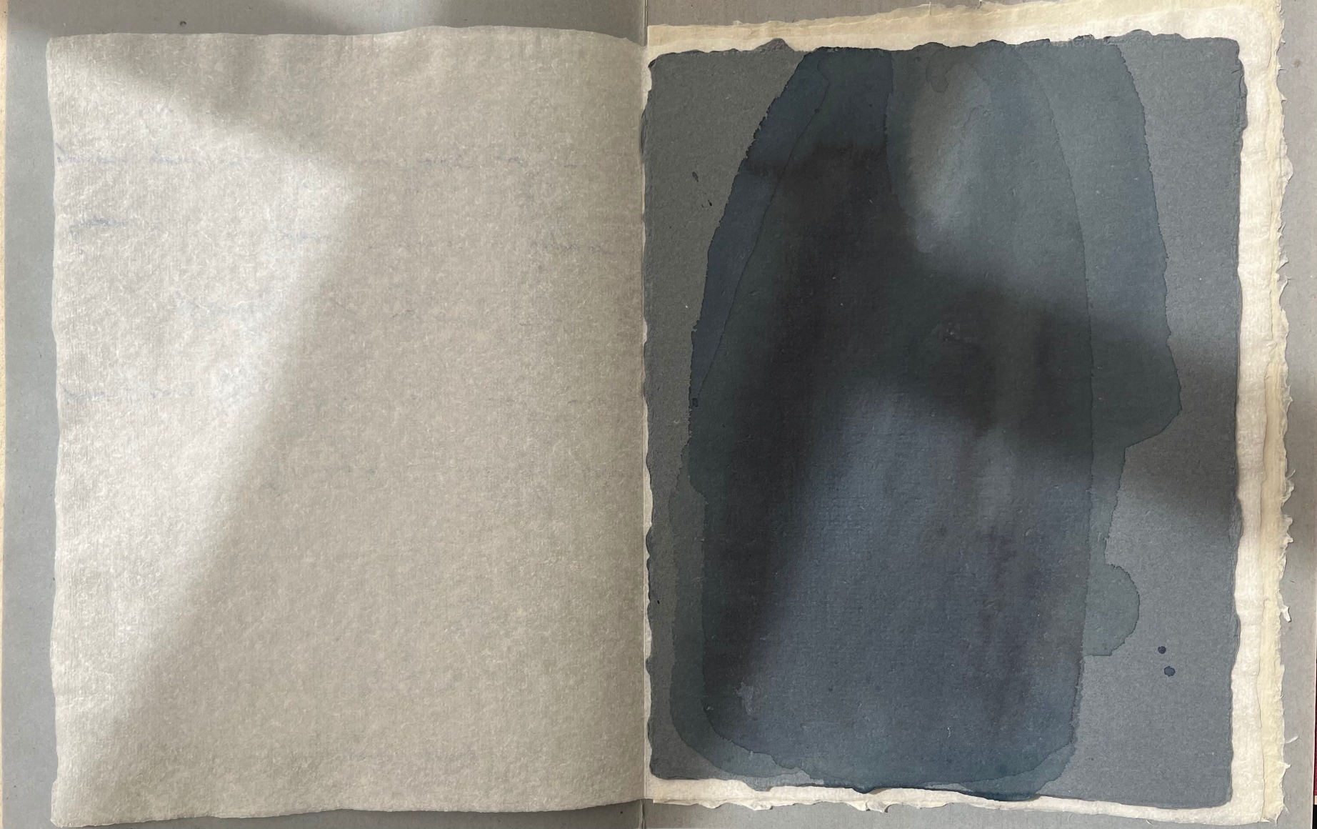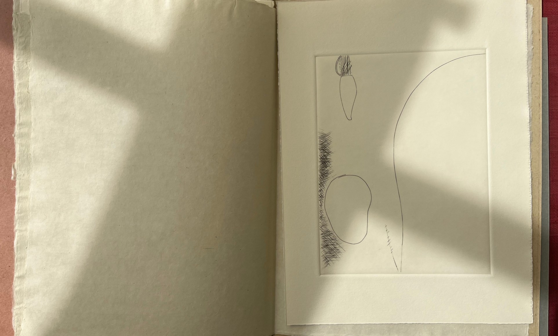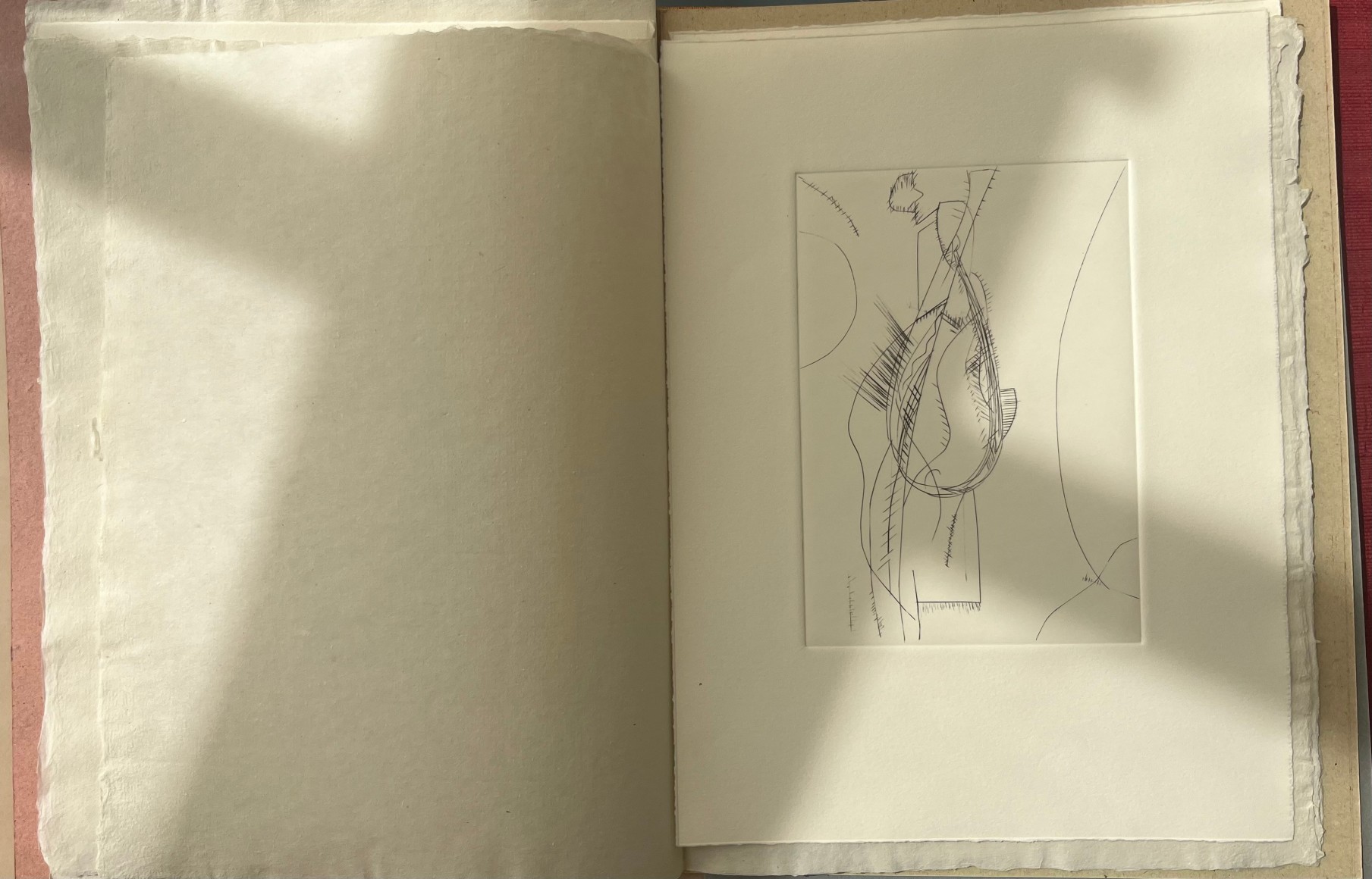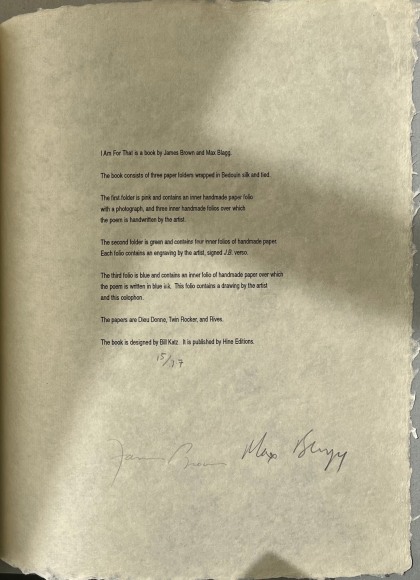 Divided into three sections, this unorthodox book consists of original drawings, engraving, collage and a hand written poem. Using paper handmade by students in Morocco as well as paper from the renowned Dieu Donne, the sections are loosely inserted into a beautiful Bedouin silk wrapper. The overall feel of this book is completely unique. Signed on the colophon by Blagg and Brown. One of 17 copies.