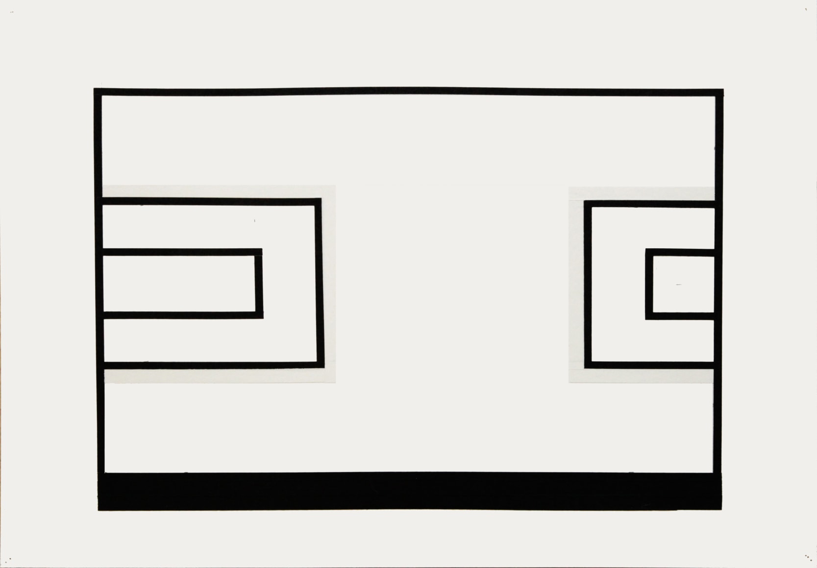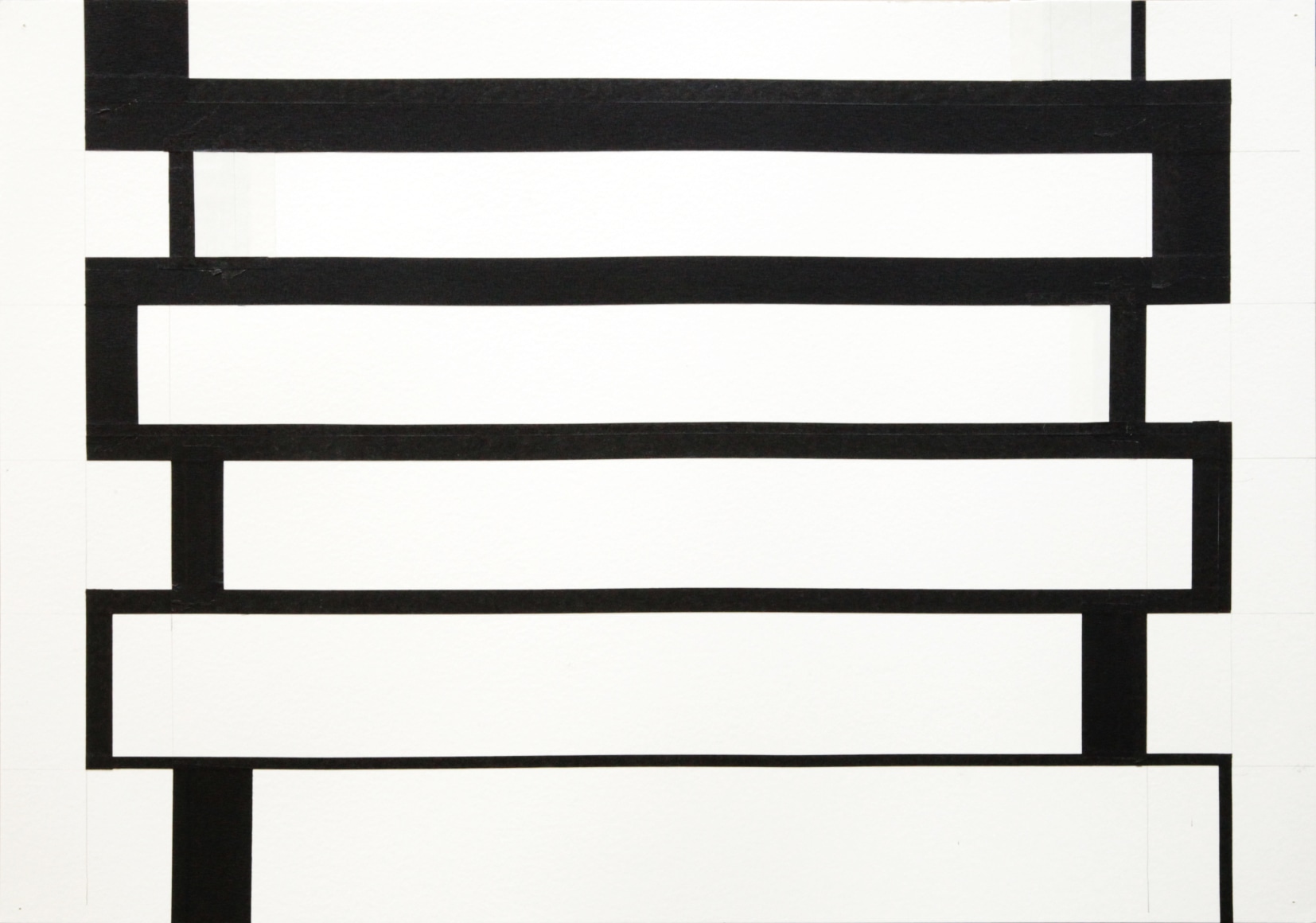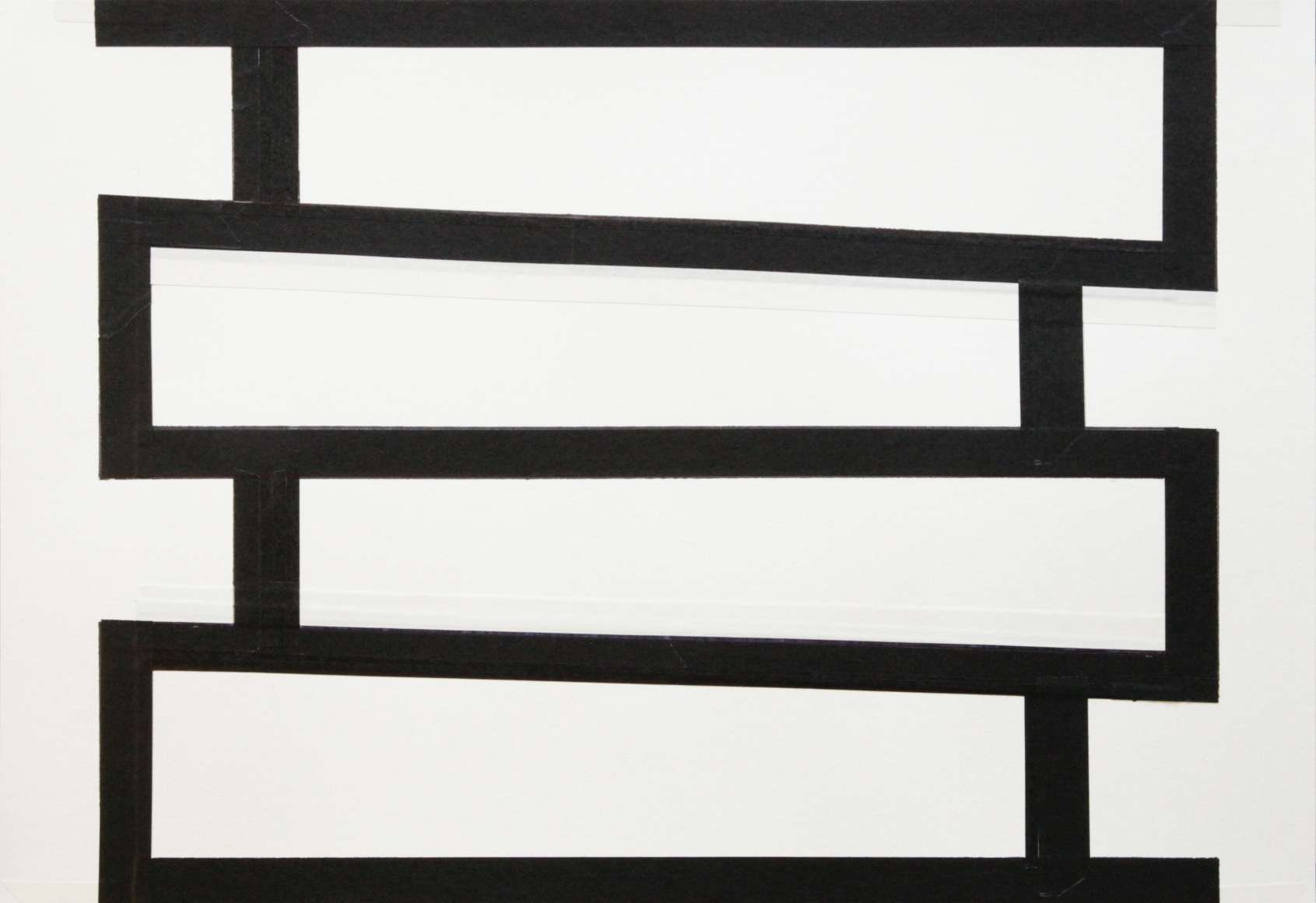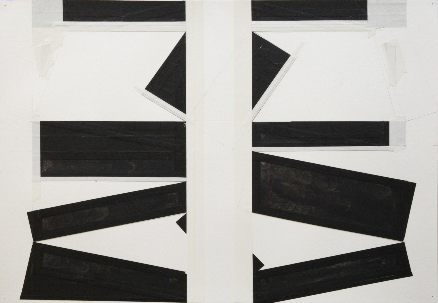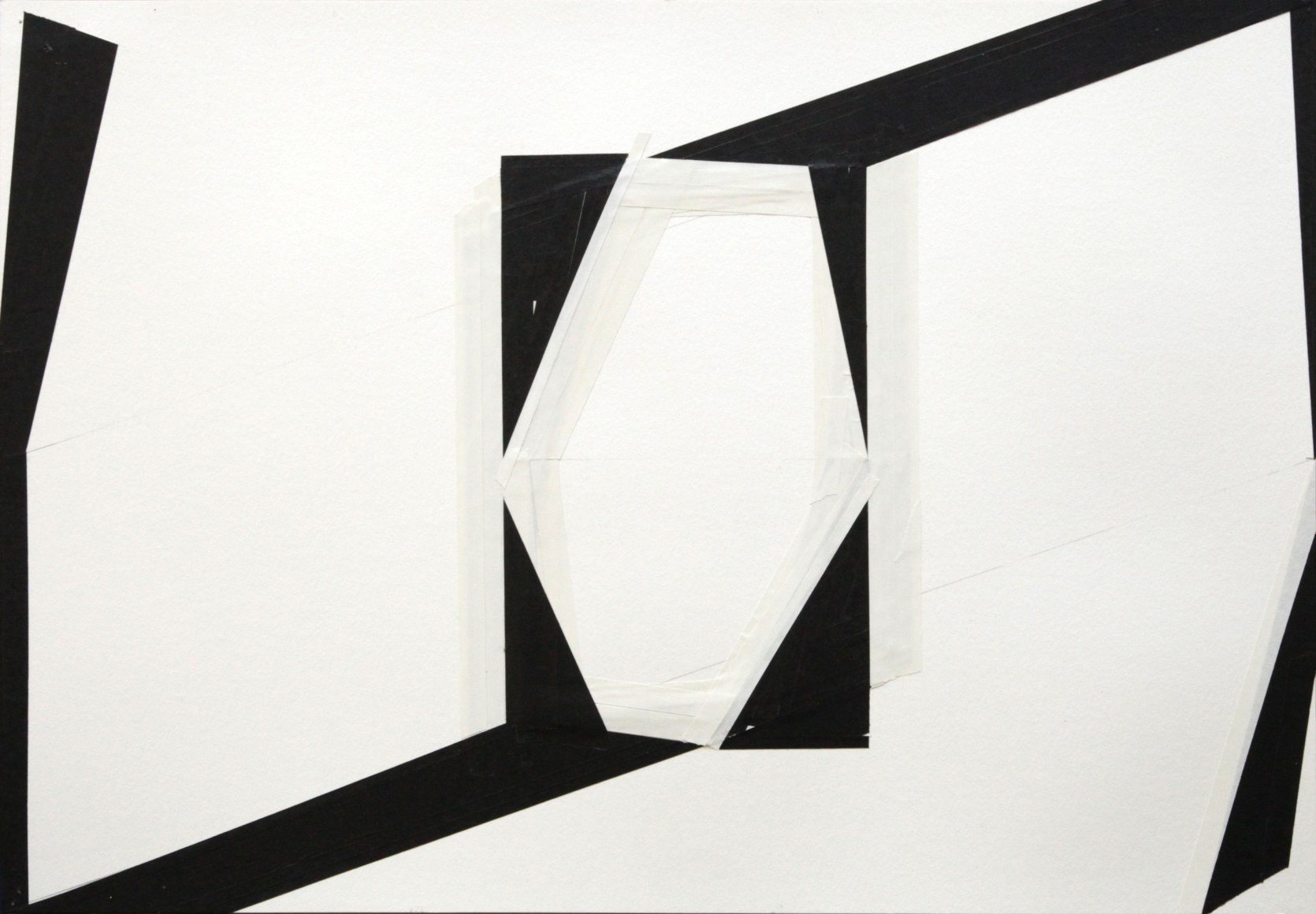 Throughout his artistic endeavor, Stephan has established himself as one who creates in the “dead center,” namely the intersection between the visual/representational and the emotional, evident in his abstract paintings in which simple tools and limited color palettes come together to undermine any attempt at coherent interpretations. This mode of working continues with his latest series of tape drawings, where layers of black and white tape are placed upon the most fundamental of canvases––––white paper. The simple presentation belies and in turn gives rise to a complex interplay that suggests yet questions and disrupts the dualism of light and shadow, of figure and ground, of positive and negative.