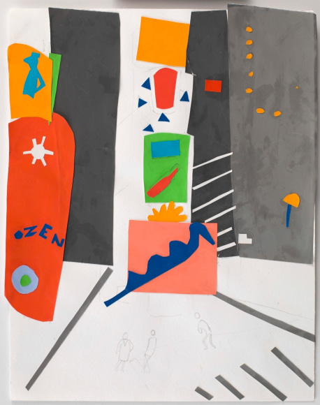 The collages on exhibition represent a selection of her most recent work. Pure striking color aligned on the page. In the realm of Matisse. With her scissors Nicole offers a new slice of New York.