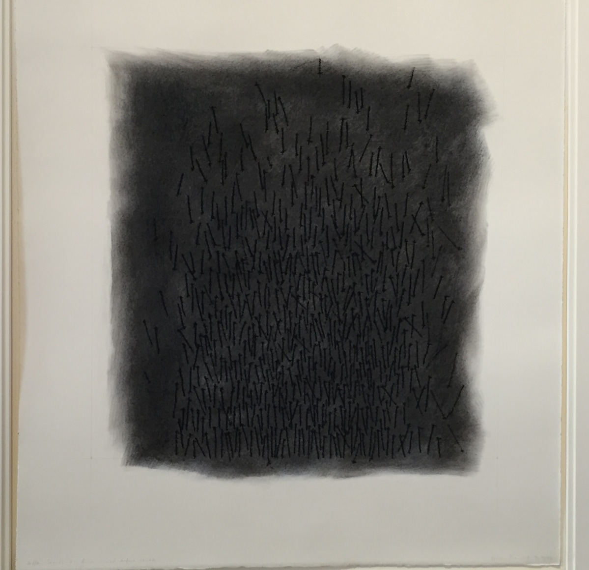 Renouf creates intricate patterns using small markings to draw the viewer into her compositions. She allows her work to slowly unfurl and speak for itself. Whether losing herself in the meditative aspects of nature with delicate washes of color or the sensuous/sinuous geometry of line, Renouf’s drawings, paintings, and prints are preoccupied with the beauty of minutiae/ little details. The subdued colors derive directly from the world around us: the red desert of Arizona; the grey of a stony mountainside; the harmony between a serene, sandy beach and the white clouds in a motionless sky. The simplicity of Renouf’s compositions coupled with the dots, cross-hatchings, fine lines, and scratches focused in different regions on the page demonstrate the artist’s careful, precise approach to making art